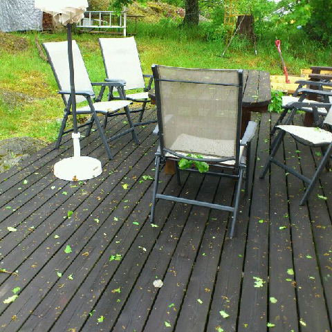 Nu har det slutat regna och blåsa (duggregnar lite bara). Altanen är full av löv och hängen från träden runt omkring. Katterna vill gå ut men kommer snabbt in igen. Fortfarande helt ok att sitta inne med en kopp te.